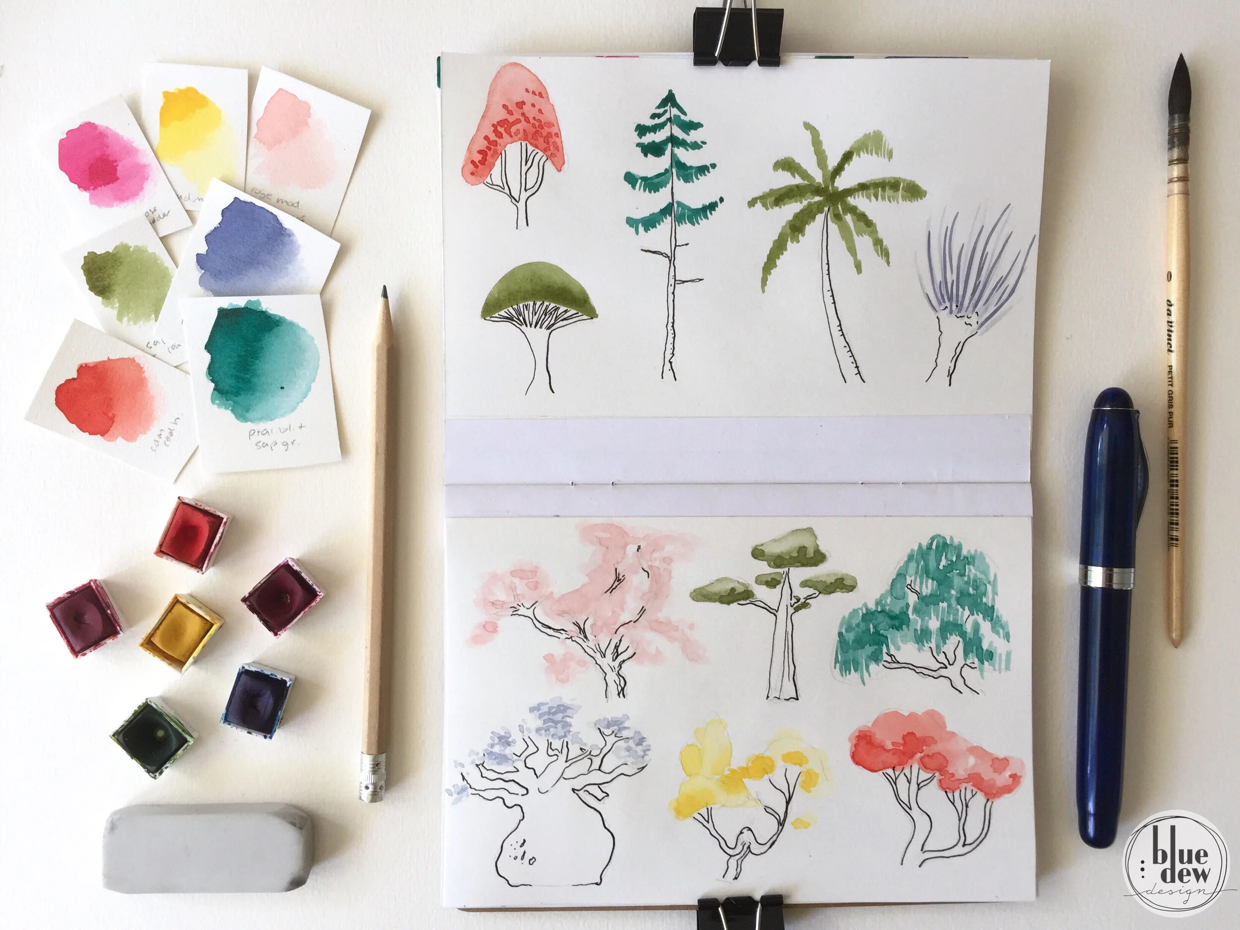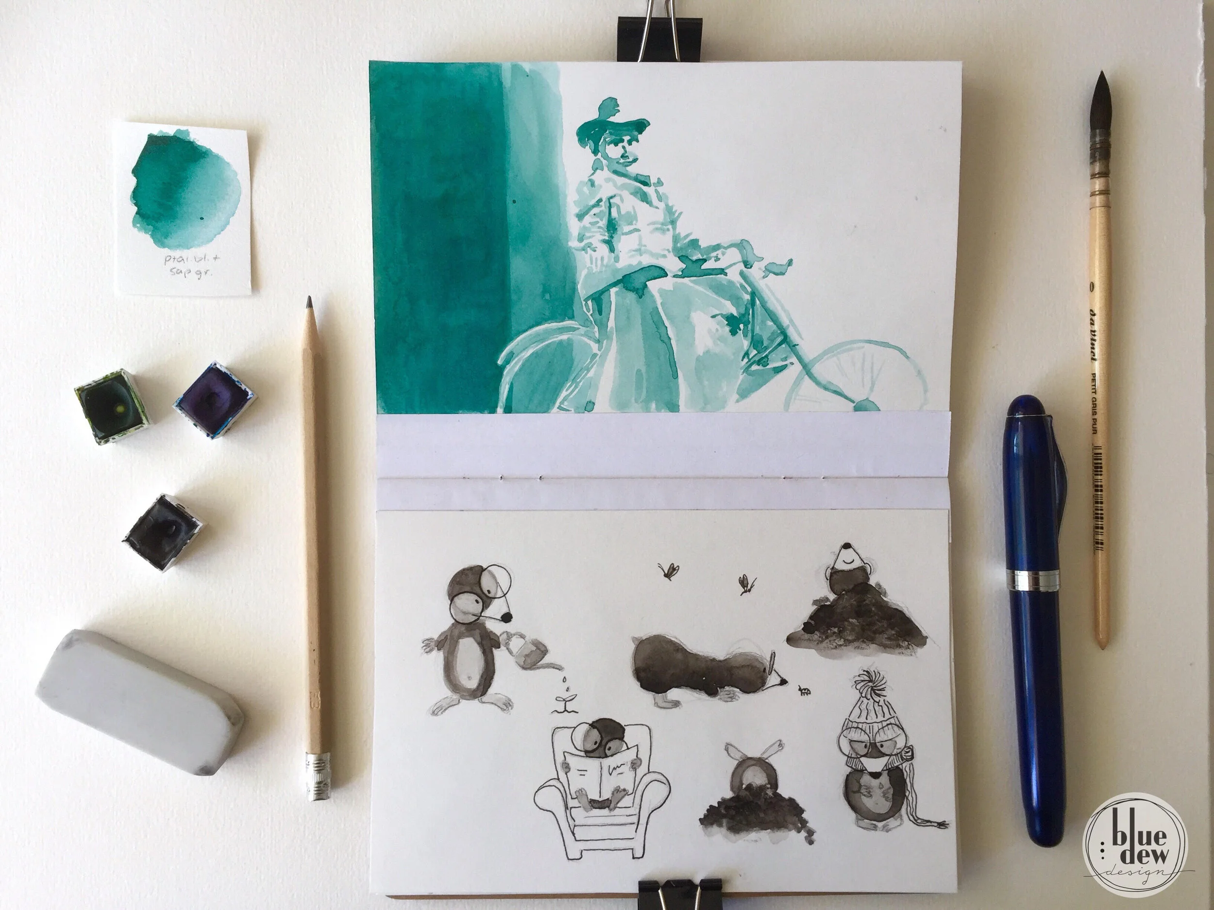 Before I started my sketchbook I decided to use a limited color palette, limited materials, and limited time for each page (around 15-30 minutes). Setting some boundaries can really spark your creativity. I use a simple pencil and an eraser, a fountain pen with a flexible nib with black ink, and seven colors of watercolor. And, of course, a special watercolor brush.