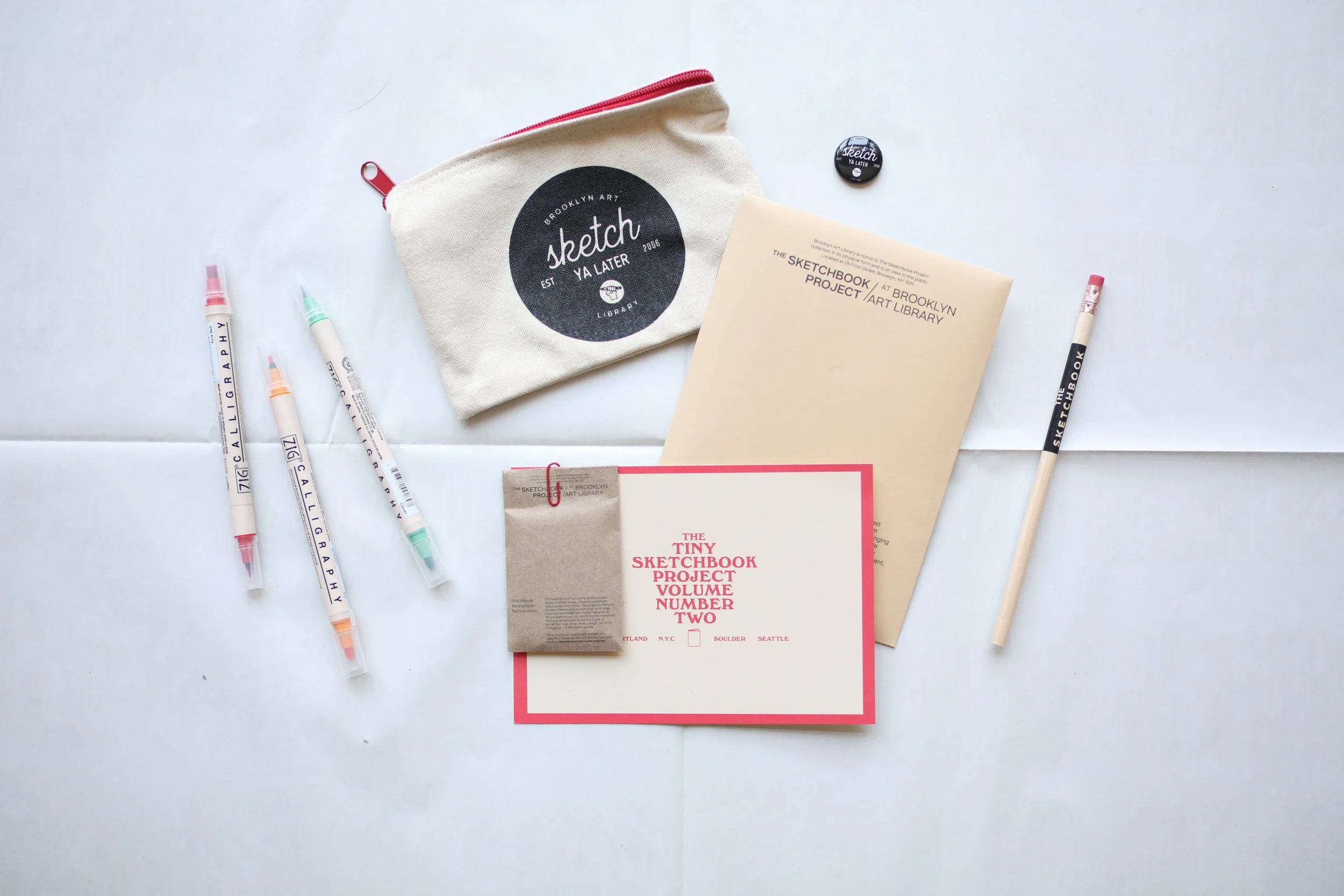 A great starter pack for The Sketchbook Project. Our custom ‘Sketch Ya Later’ pouch holds all the necessary sketchbook friendly pens and pencils for a fully ink or pencil filled sketchbook.